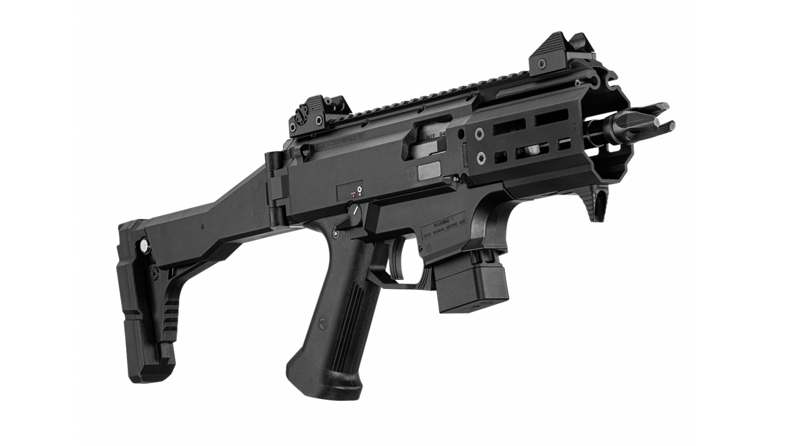 Hoch kompakte selbstladende Waffe mit Kaliber 9×19, abgeleitet von der weltweit populären Serie CZ SCORPION EVO 3 Kategorie Pistol Calibre Carbine. Trotz nur 140 mm Lauflänge behält dieses Modell hohe Genauigkeit. Den Schießkomfort unterstützt ein wirksamer Spiralmündungsfeuerdämpfer mit drei Stegen. Sicheren und zuverlässigen Griff bietet der kurze Vorderschaft aus widerstandsfähiger Aluminiumlegierung, an den unten ein Handanschlag angebaut ist. Dem Benutzer stehen Montageschnittstellen Picatinny und M-LOK zur Verfügung. Das Modell CZ SCORPION EVO 3 S2 MICRO wird mit klappbarer Teleskopschulterstütze mit QD-Öffnung für Schnellspannklemme des Riemens oder mit Aufsatz mit langer Öse für den Riemen geliefert.