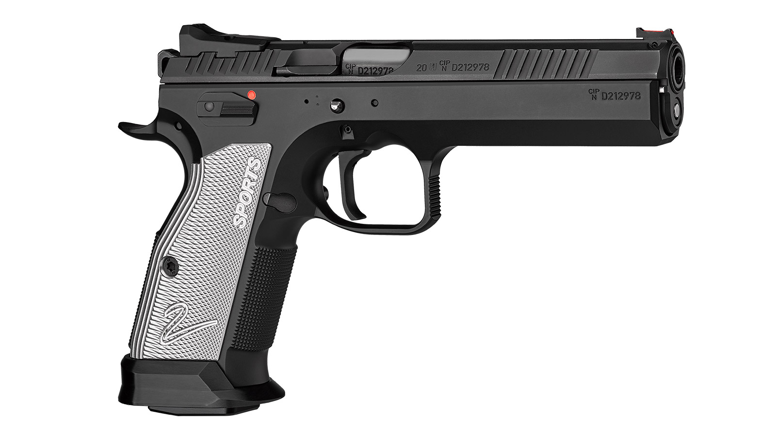 Grundausführung der Sportpistole für die Division Standard nach IPSC-Regelwerk oder Zielscheibenschießen, geeignet für Anfänger und fortgeschrittene Wettkämpfer. Die Pistole hat silbern eloxierte, flache Duralgriffschalen, festes Metallvisier und flache Bedienelemente der beidseitigen manuellen Sicherung. Zur Lieferung gehört ein Pin zum Austausch des Verschlussfangs (Slide Stops).